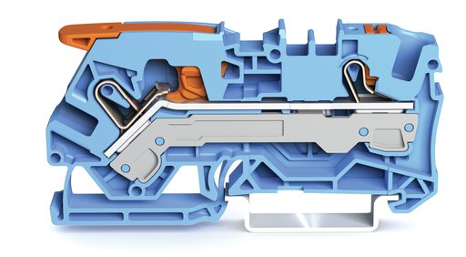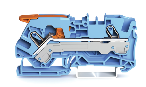 2-conductor through terminal block; with lever and push-button; 6 mm²; with test port; suitable for Ex i applications; side and center marking; for DIN-rail 35 x 15 and 35 x 7.5; Push-in CAGE CLAMP®; 6,00 mm²; blue