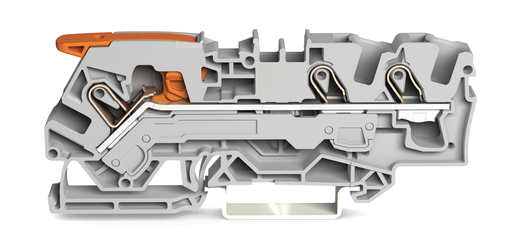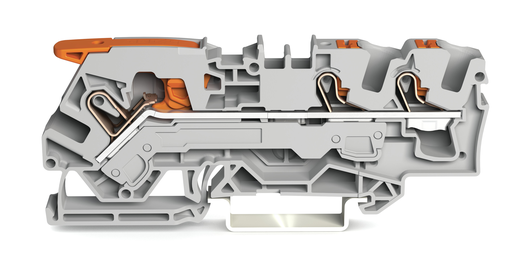 3-conductor through terminal block; with lever and push-button; 6 mm²; with test port; side and center marking; for DIN-rail 35 x 15 and 35 x 7.5; Push-in CAGE CLAMP®; 6,00 mm²; gray