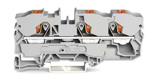 3-conductor through terminal block; with push-button; 10 mm²; with test port; side and center marking; for DIN-rail 35 x 15 and 35 x 7.5; Push-in CAGE CLAMP®; 10,00 mm²; gray
