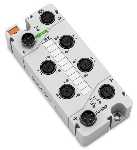 Indicators: LED (F) red: Error status; LED (SB) green/red/orange: System bus status; LED (ULS, UA) green: Power supply status; LED (0 … 7) yellow/red: Status/diagnostics DI/DO 1 … DI/DO 8; Non-retentive displays