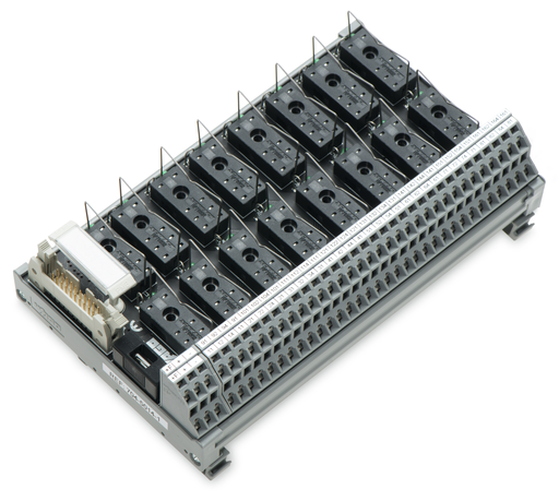 Interface module for system wiring; Pluggable connector per DIN 41651; Male connector; 20-pole; 16-channel relay output; 1 changeover contact; Double-deck PCB terminal blocks; in mounting carrier