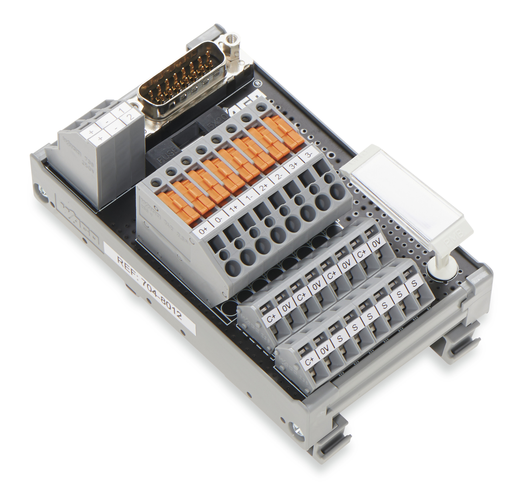 Interface module for system wiring; Pluggable connector per DIN 41651; Male connector; 10-pole; 8-channel digital input or output; 3-wire connection; with disconnect terminal block; in mounting carrier