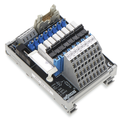 Interface module for system wiring; Pluggable connector per DIN 41651; Male connector; 10-pole; 8-channel relay output; 1 changeover contact; Triple-deck PCB terminal blocks; in mounting carrier